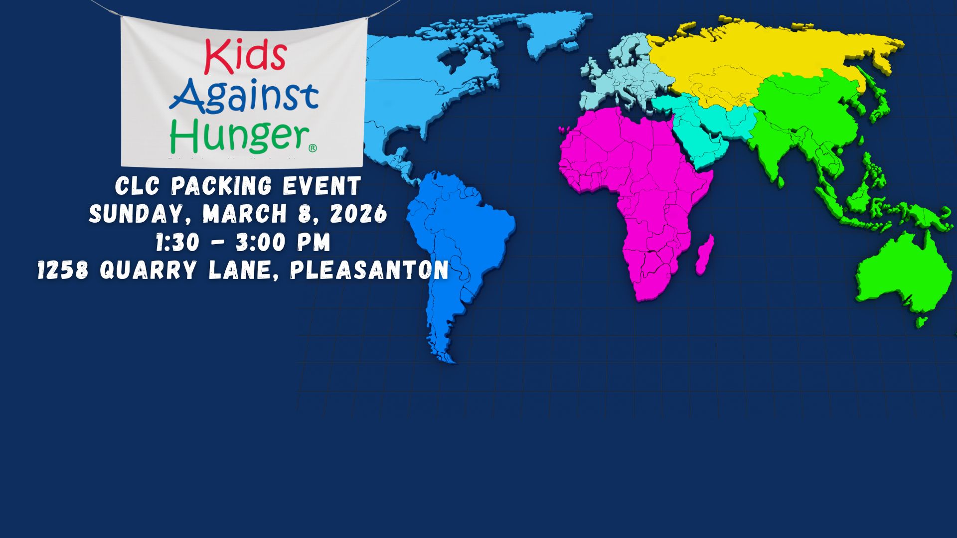 Join us as we partner with Kids Against Hunger to pack meals for children in need! This fun and meaningful service project will take place on Sunday, March 8, from 1:30–3:00 PM at KAH Headquarters: 1258 Quarry Ln, Pleasanton—right after church.